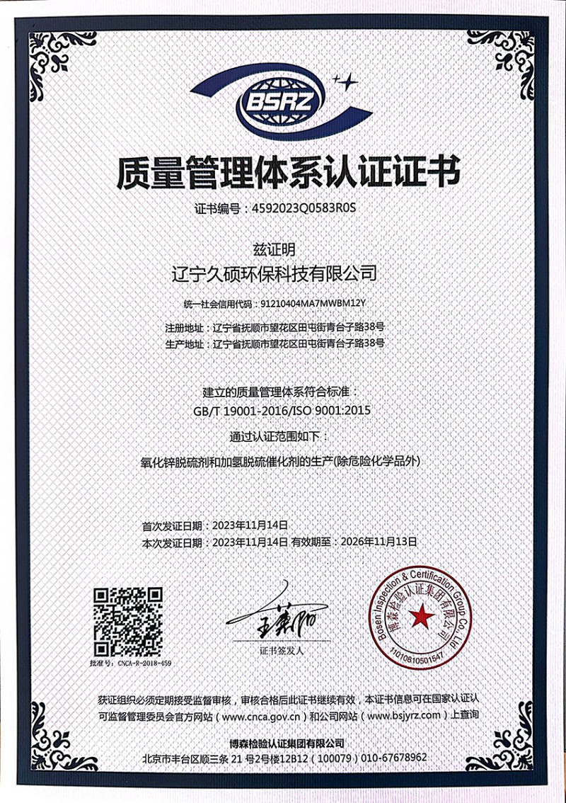 質(zhì)量管理體系認(rèn)證證書