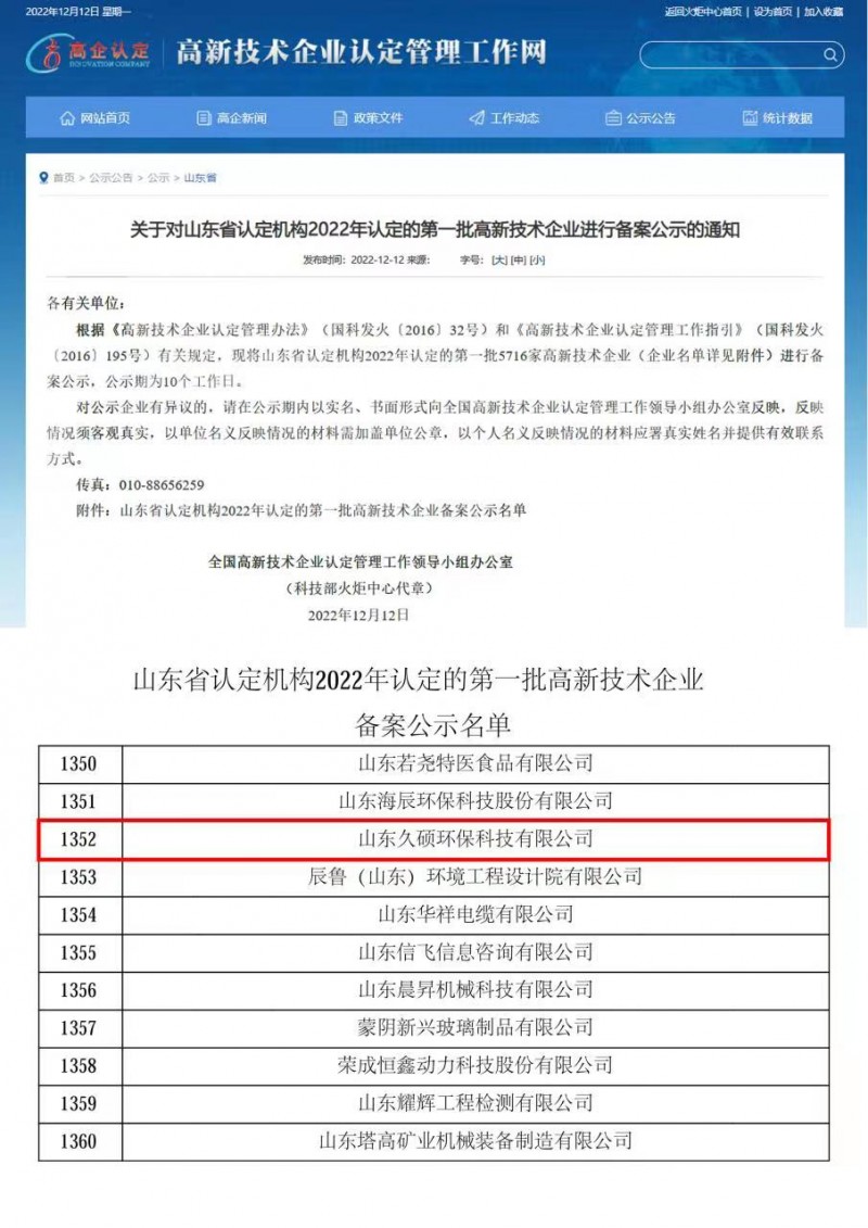 山東久碩環(huán)保科技有限公司,成功申請(qǐng)成為高新技術(shù)企業(yè)