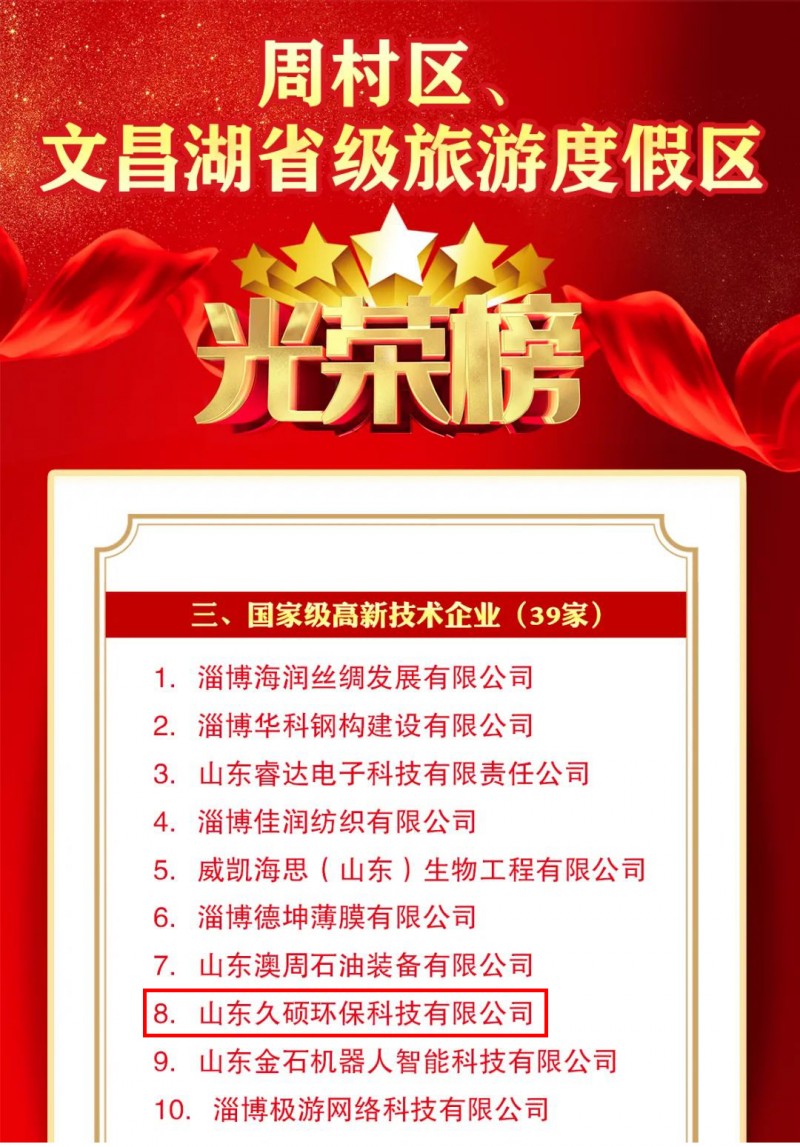 山東久碩環(huán)保科技有限公司,榮登周村區(qū)高新技術(shù)企業(yè)光榮榜